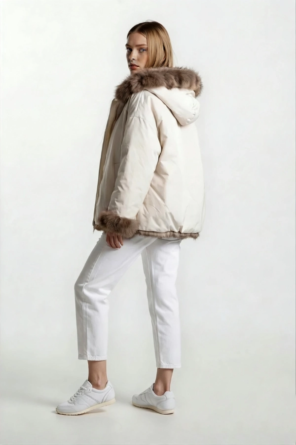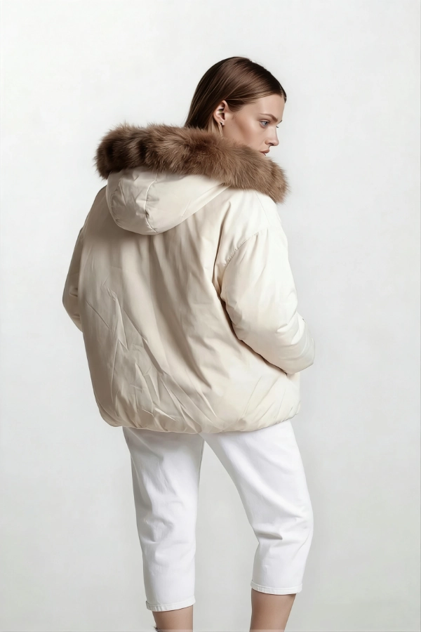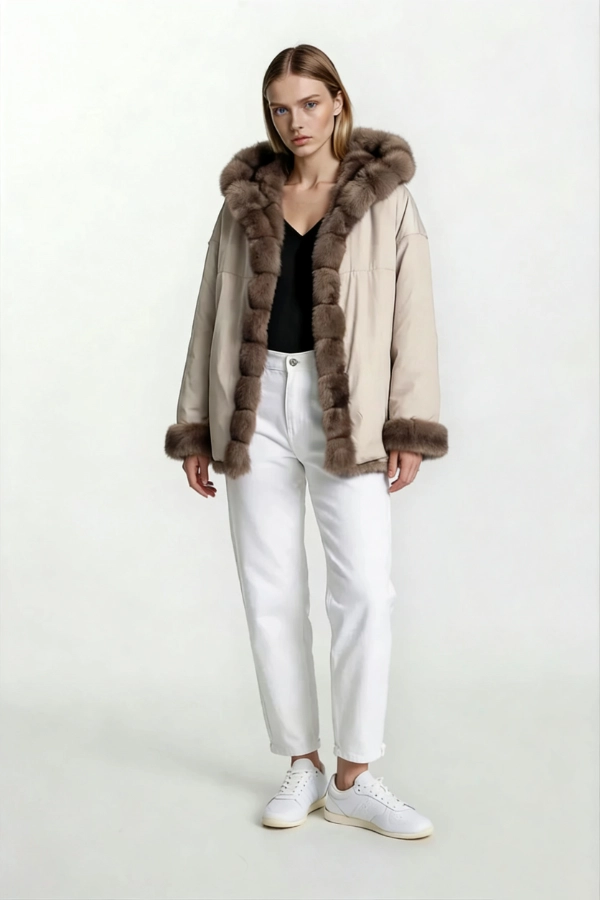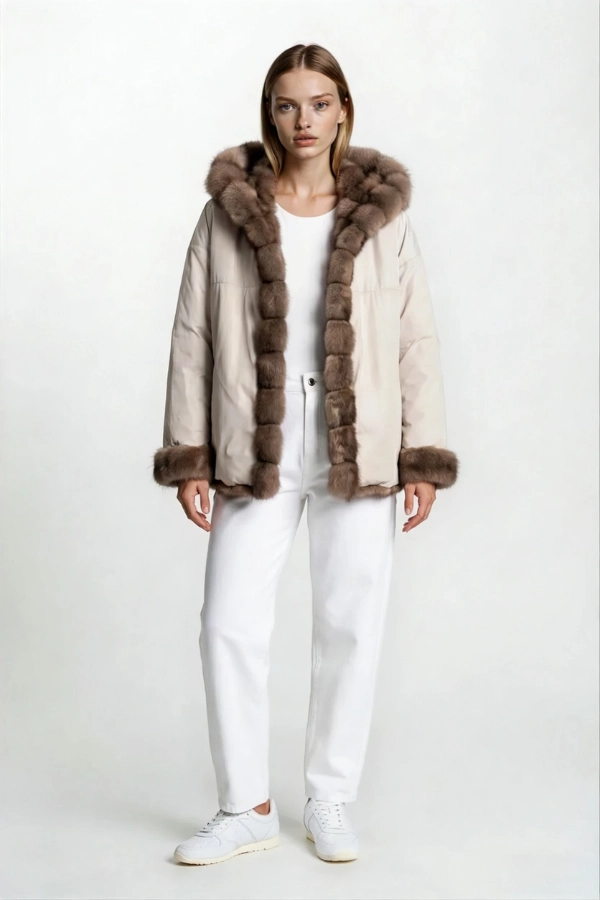 Short reversible jacket. Crafted from a combination of premium sable, horizontally worked, and high-performance technical fabric. Features a versatile dual-sided design with fur trim on the hood, cuffs, and front placket.