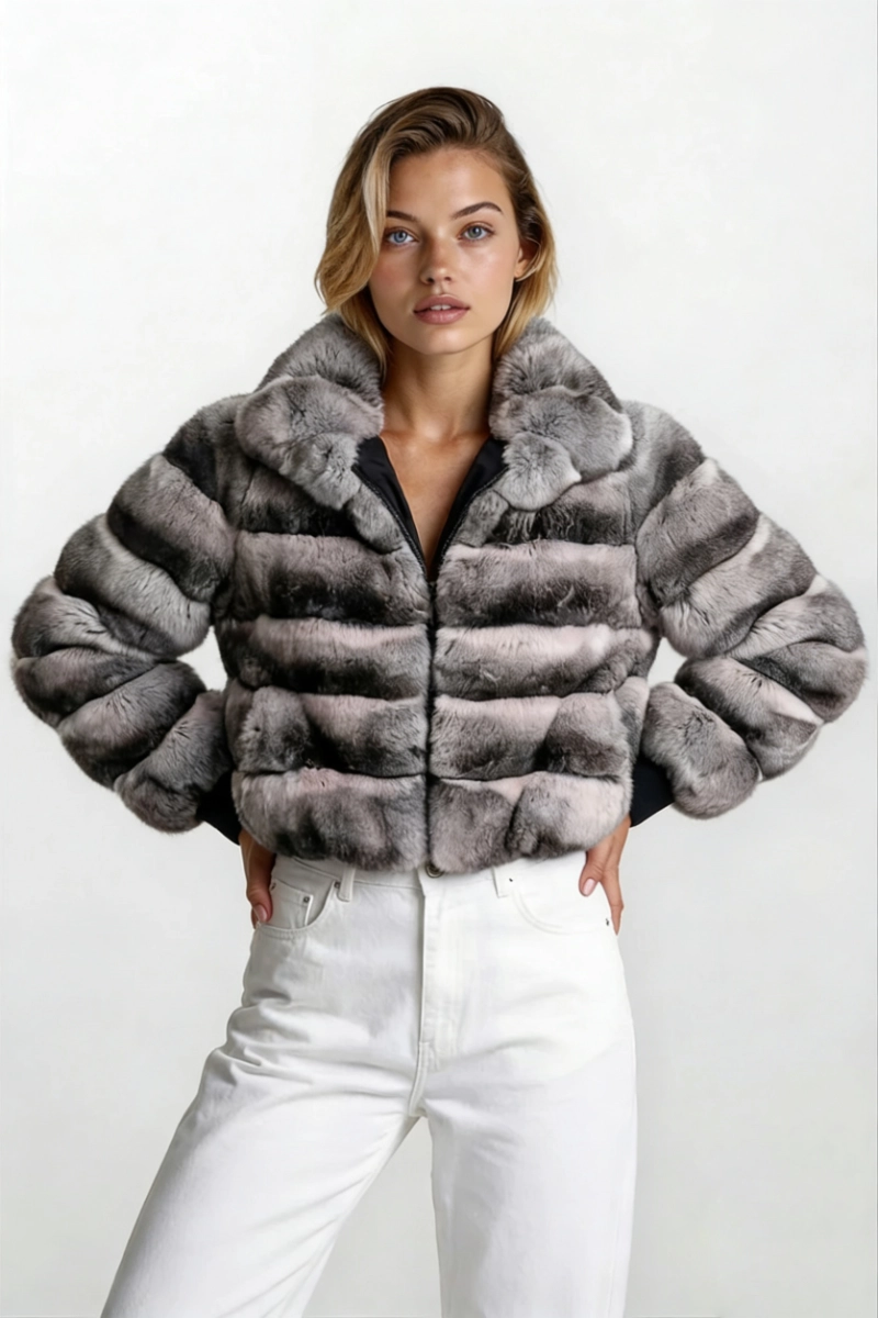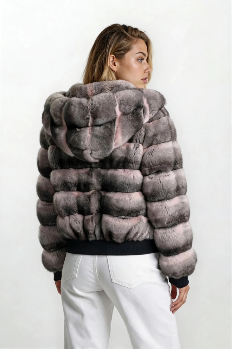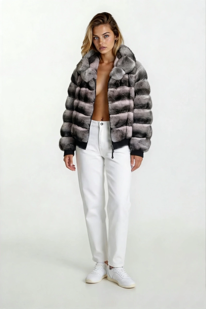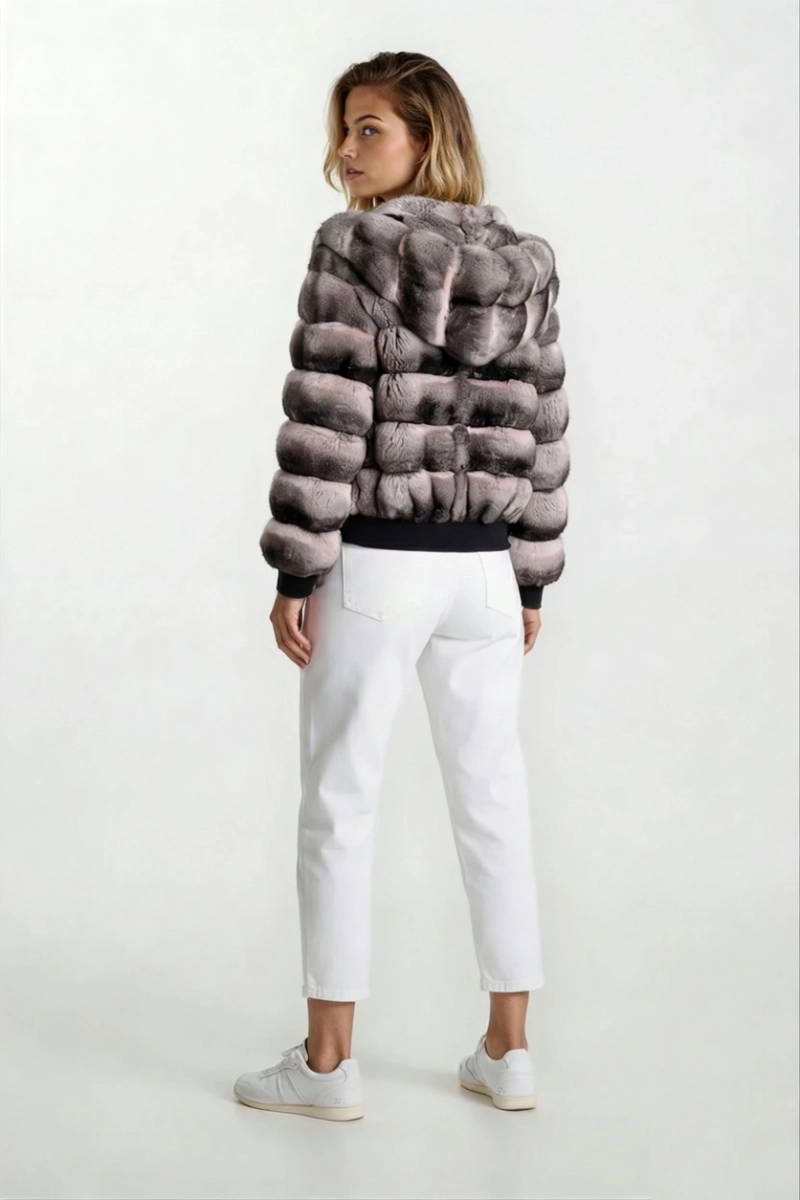 Casual short bomber jacket crafted from chinchilla fur, featuring a hood, elastic cuffs, and elastic hem.