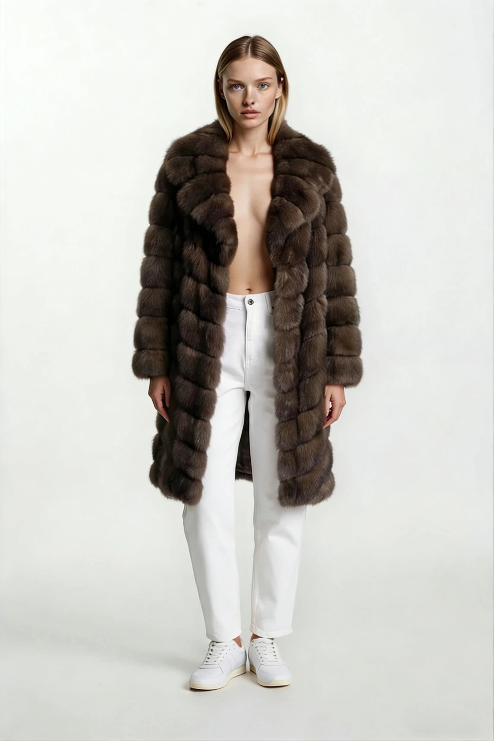 Long coat crafted from horizontally worked sable. Features side inset pockets and a concealed hook fastening.